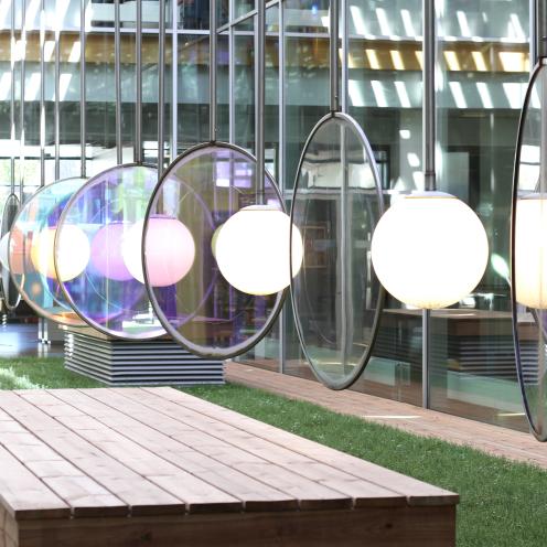 I det ene gårdrum ses en række farvede, runde skærme, som drejer rundt og reflekterer lyset gennem opsatte spejle i prismeformer